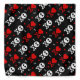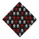 Seamless pattern of a white with red skull and a black background with hearts and crossbones.