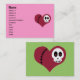 This skull heart business card design features a cartoon skull with hearts in its eyes on a reddish pink stitched up heart! These cards are great for networking in a stylish way! Customize them with your contact information (email address, mailing address, phone number, cell number or anything else you want!).