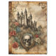 A storybook illustration of an old fairytale, with a skull in a frame and a castle on a rose-covered hill. A faded, partial map, another skull, illegible text, and flying birds complete the scene. If you like the dark fairytales, this is the clipboard for you!