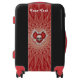 This custom suitcase has a white skull in a Gothic red Heart outlined in white bones on a spiral line pattern on a red background. Customize your text with the template.