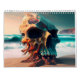 A large skull sits on top of the sand in the ocean, in the style of surreal 3d landscapes, intense color palette, redshift, vibrant illustrations, photo-realistic landscapes, textural explorations