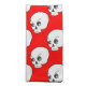A pattern of white skulls on a red background. Original design with newsprint effect. Black, white and red cartoon image.