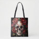 Tote bag features goth watercolor artwork of a human skull surrounded by red roses against a black background.