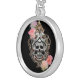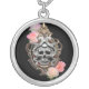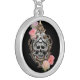 A necklace with a skull inside a frame with two pink roses and two white roses.