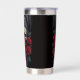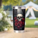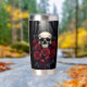 This skull tumbler is mysterious, almost threatening. The scene is in a misty, scary forest with leafless trees. Maybe something is going to jump or crawl out from behind a tree. The red roses are beautiful, and the dripping wax adds a great effect. This is a great gift for anyone, especially around Halloween. It makes one think what is out there while sipping coffee, or having a cold drink.