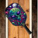 A pickleball paddle adorned with a vivid painting of a skull and alien heads, creating a surreal and otherworldly design.