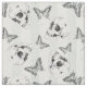 Custom fabric in a skulls and butterflies print. The hand drawn skulls and vintage butterflies are against a light gray striped background with a grungy old paper texture. This fabric is suitable for Gothic style crafting and sewing projects.