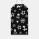 Skull and crossbones with pretty snowflakes and stars against a black background.