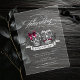 This dark, Gothic themed wedding collection is suited for any time of the year including Day of the Dead, Dia de los muertos and Halloween. The set features skulls, ornate scrollwork frames and lush flowers all in black and silver with burgundy accents. Elegant 'Hallowedding' calligraphy is optional and can be deleted to use this transparent acrylic invite for engagement, rehearsal dinner, wedding , bridal shower, bachelorette, stag party as desired. Add your event details using the provided template. Search ID866 to see other products and color options for this design set.