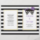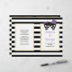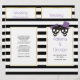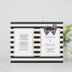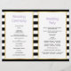 Skull couple with a purple bow the bride and purple hat the groom, and black and white stripes modern Halloween folded wedding ceremony and party program. There are white frames with gold outline with your text.