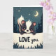 This greeting card shows a cute cartoon skunk peeking over a cream-colored banner, with its front paws resting on the top edge. The skunk has big, gentle eyes and rosy cheeks, and a bright white stripe runs from its forehead down its back. Behind it is a deep teal-blue night sky with tiny stars and a small crescent moon glowing overhead. Dark pine tree shapes frame the scene near the top and bottom, making it feel like a quiet forest at night. Under the skunk, the words “LOVE you” appear, with “LOVE” in thick uppercase letters and “you” in a smooth, cursive-style lowercase. The message sits centered near the bottom, and it reads like a simple, direct way to say what you feel. It’s meaningful because the skunk’s shy, sweet expression makes the love note feel honest and a little tender 🥰❤️.