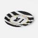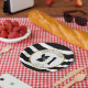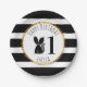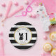 Birthday paper plates featuring an illustration of a baby skunk wearing a flower crown. Background is black and white stripes with pom pom design. Personalize the name and number