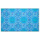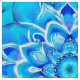 Fabric in a batik mandala flower pattern in shades of soft sky blue to deep cobalt, accented with white