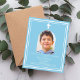 A sky blue background, decorated with a white frame, and a white cross Personalize and add a photo name and details. White text. Arch shaped photo frame.