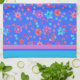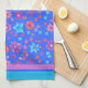 A pretty Kitchen Towel, with a pattern of flowers in purple, turquoise, pink and orange on a sky blue background, from a handpainted paper collage by Judy Adamson. You can easily change the background color, if you wish, by using the Edit button.