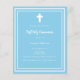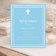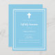 A sky blue background, decorated with a white frame, and a white cross Personalize and add the name and details. White text.