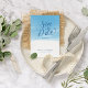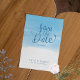 Save the date- elegant modern handwritten swirly script typography on modern blue and white background watercolors ombre.