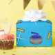 Modern and trendy sports sky blue curling pattern background with a curling stone rock and brooms. Sports gift ideas for men, women and boys and girls. Ideal for birthdays.