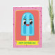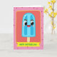 Designed with a cheerful digital illustration, the card centers on an anthropomorphic frozen treat in luminous sky-blue, standing on a light-toned stick and leaning forward as if greeting someone close ❤️. Its rounded shape has gentle vertical contours, and its face shows big eyes with white highlights, brown arched brows, and a wide smile with a soft pink interior that feels openly friendly. A faint blush on the cheeks adds a tender, affectionate look, like it’s sharing a warm moment with the viewer. The character sits inside a coral-red rectangle bordered by a sunny yellow outline, giving the scene a cozy, framed-in embrace. Behind that, a pastel-pink background is dotted with scattered deep-red polka dots, creating an upbeat, lighthearted setting 🌼. Along the lower portion, a bright yellow banner overlaps the red frame, carrying a clear message in verdant green lettering. The coral-red rectangle has a vivid yellow border that crisply traces all four sides.