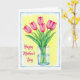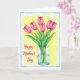 This design shows a still-life illustration of seven petal-pink flower buds rising in a gentle arc, their soft texture suggesting they’re just about to open like a quiet gesture of affection ❤️. Long green stems gather neatly into a clear, cylindrical glass vase, where blue-tinted water bends the light and reveals the pale lines of the stems below the surface. Behind the bouquet, a sunlit yellow wash glows outward and fades into the white background, giving the scene a warm, intimate feel like two friends lingering in a bright kitchen. Along the lower left, a looping fuchsia message appears, set slightly above the bottom edge so it feels tucked in like a private note. A loose, irregular sky-blue border frames the artwork, adding a relaxed, painted edge that keeps the bouquet centered. The colors stay soft yet lively, with the pink buds and green stems standing out against the yellow field like a gentle exchange between close hearts 🌼. The sky-blue frame varies in thickness as it traces around the white space, with small uneven brush edges visible at the corners.