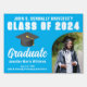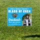 This bright sky blue custom senior graduation announcement yard sign features classy white typography of your college name for the class of 2025. Customize with your graduating year under the chic black handwritten script and grey grad cap for great outdoor decor.