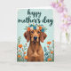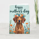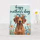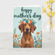 This card shows a sweet portrait of a short-haired dog with warm brown fur and long, floppy ears, looking straight ahead with a tender, steady gaze ❤️. A flower crown rests across its head, mixing orange, blue, and white blooms with small green leaves, like a gentle gift placed with care. Along the lower third, more orange flowers and green stems gather in a loose border that feels like a garden at the dog’s feet. Near the top, the words “happy mother’s day” sit centered above the dog in flowing teal lettering, standing out clearly against the pale background. The overall lighting stays soft and even, giving the fur a smooth look and making the petals seem fresh and lightly shaded. The calm arrangement and the dog’s affectionate expression create an easy sense of closeness, like a quiet moment shared between loved ones 🌼. Behind everything, the background is a light sky-blue wash with a subtle, brushed texture.