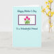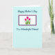 Designed with a calm, pale sky-blue background, this card keeps the layout simple while still feeling affectionate ❤️. In the center sits a bright white rectangle bordered in fuchsia pink, with a thin darker teal outline that adds a neat, polished edge. Inside the frame, three stylized flowers open toward one another, their fuchsia petals and slim green stems leaning in like close friends sharing a quiet moment. Near the top of the framed area, the words “Happy Mother’s Day” appear in dark teal, set in flowing, cursive-style lettering. Beneath the framed flower illustration, “To a Wonderful Friend” is placed in the same dark teal, aligned neatly so the message feels balanced and easy to read. The cool blues and greens against the punchy pink create a gentle contrast, like a soft spring morning with a warm, caring gesture 🌼. The three blossoms sit clustered together within the white panel, their petals reaching upward from the lower portion of the frame.