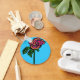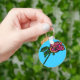 This pretty keychain features a colorful rose on a sky blue background