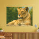 Bring the strength and serenity of the wild into your space with this striking portrait of a lioness resting atop a weathered stone ledge. Her amber eyes meet yours with quiet confidence, framed by golden fur and dappled sunlight. Set against a backdrop of soft clouds and lush greenery, this artwork captures the essence of feminine power and natural elegance.