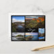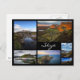 Photo postcard with a collage with various landscapes on the Isle of Skye, like Quiraing, Neist Point, Sligachan bridge, the Old Man of Storr and Portree in a black frame and the text: 'Skye'.