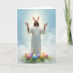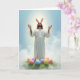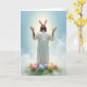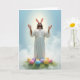 This design shows a central robed figure with long hair and a beard, looking upward with arms open as if welcoming someone close, and a pair of bunny ears perched on the head 🐰. A bright halo-like glow radiates behind the figure, fading into a pale blue sky with soft, thin clouds. The white clothing catches the light, giving the scene a gentle, romantic warmth, like an embrace made visible. Near the top, the greeting text sits above the figure in light pink lettering, spaced neatly across the sky. Below, a small patch of green grass rises from mist, suggesting a quiet spring morning 🌷. Spread across the grass are smooth egg shapes in pastel pink, lavender, yellow, and baby blue, adding a tender, friendly touch to the setting. The foreground mist curls around the base, and the pastel eggs rest in clusters along the grass line.