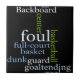 The artwork features a word cloud design prominently displayed against a solid black background. Various words and phrases associated with basketball are arranged in a dynamic and visually engaging manner. Terms like "backboard," "basket," "dunk," "foul," "full-court," "goaltending," "guard," "center," "goal," "line," "field," "press," and "basketball" are presented in different sizes, weights, and orientations (horizontal and vertical). The color palette includes shades of white, light blue, and lime green, providing contrast and highlighting different aspects of the basketball lexicon. The overall effect is a bold and impactful representation of the language of the game.