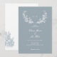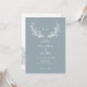 This delicate dusty blue botanical wreath monogram wedding invitation sets a soft, romantic tone for your special day, embodying minimalist French country elegance with a touch of vintage charm. Featuring a muted slate blue background adorned with intricate white line-art botanical wreaths framing a custom monogram at the top, this design blends elegant script calligraphy for the couple’s names with refined serif typography—creating a polished, understated look that feels both timeless and intimate.