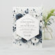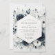 This elegant design features a dramatic and moody botanical arrangement. Lush, inky slate blue and soft white watercolor roses are beautifully complemented by delicate anemones with dark centers. Sprays of dusty blue foliage soften the composition, creating a romantic, painterly, and sophisticated aesthetic for a memorable union.