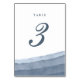 Slate blue ombre watercolor wedding table number cards, part of our dip-dyed modern watercolor wedding stationery collection. Featuring shades of dusty blue-gray, applied in painterly strokes of elegant watercolor wash, matched with simple classic text.