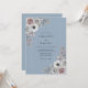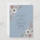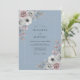 A delicate botanical arrangement graces this design with muted hues of slate blue and soft blush. The artistic floral display evokes a gentle and romantic atmosphere, perfect for an elegant union. Subtle hints of creamy white blossoms intermingle with grey-toned foliage.