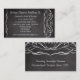 Slate chalkboard-look business card from the matching set features dark charcoal gray background with slate blackboard effect, and white chalk handwritten drawing look writing in the foreground. Decorative swirl motif adds a touch of casual elegance. All Designs Copyright © www.CustomInvitesOnline.com