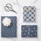 Create the best looking gift under the tree this year with these wrapping paper sheets in coordinating patterns. Set features a tonal buffalo plaid, modern geometric trees, and classic snowflakes, all in smoky slate blue and white.