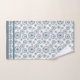 A cute slate gray blue circle stylized floral pattern bathroom towel set with a handsome symmetry and a repeated blue line border. A simple modern abstract geometric pattern.