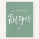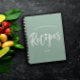 Charming recipe book in muted green. Personalize with your name and the year. Recipes is written in a black brush script with a doodled heart replacing the dot over the i.