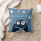Cool personalized throw pillow for your little monster's room features their name in turquoise lettering on a slate blue background decorated with white stars and a cute smiling monster wearing a dapper bow tie.