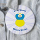 Ukrainian Flag is blue on top and yellow on the bottom. Here, we have an angel dressed in the blue and yellow flag of Ukraine. Background is white, sunburst streaks. Above, in blue letters reads SLAVA UKRAINI. Below, in the same color are the words GLORY TO UKRAINE. Shows here on an extra large button. You can choose from various sizes to fit your need and your budget..