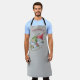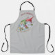 Whimsical Holiday themed apron features watercolor illustration of a pair of gnomes on a fast moving sled. Gray background with customizable text in modern dark red font.