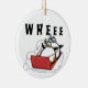 A couple of penguins have a blast sledding down a snowy hill and text reads "Wheee" on Sledding Penguins holiday keepsake ornaments.