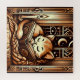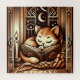 Adorable art deco art style illustration of a cat sleeping on a book by candle light, in front of a window with a night sky with moon and stars outside. The colors are a brown sepia tones.