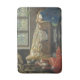 This design features a painting by the British Pre-Raphaelite artist John Collier (1850–1934). It shows a beautiful woman sleeping in a grand medieval castle. Two of her sisters are kneeling beside the bed feeling sad and sorrowful. The bed has intricate engravings and carvings. There are expensive fabrics in the curtains and in the women's costumes. They are clearly wealthy noblewomen. There is stained glass in the windows, and outside there appears to be verdant woodland. The image may represent the fairy tale known as Sleeping Beauty, which is about a princess cursed by an evil fairy to sleep for a hundred years before finally being awakened by a handsome prince. The original artwork was painted by John Collier in 1929.