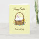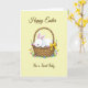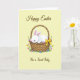 The front design shows a plump white bunny 🐰 curled up asleep in a brown woven basket, its closed eyes and faintly rosy cheeks giving it a tender, cared-for look. Long ears with soft pink inner tones rise above the basket rim, as if leaning in close like a quiet friend. Around the basket are small sprigs of greenery and scattered spring flowers 🌷 in pastel pink, soft blue, and gentle yellow, tucked along the weave and peeking out from underneath. A golden bow is tied neatly to the basket handle, adding a cozy celebratory touch without taking over the scene. The background is a pale yellow with a light texture that makes the basket and blossoms stand out softly. Curved cursive-style lettering in a sepia-brown color sits along the top and bottom edges, framing the central image. The basket’s wicker strands are drawn with fine detail, and the little flowers dot the base in small clusters of pink, blue, and yellow.