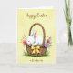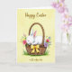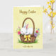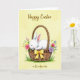 This card shows a softly textured pale yellow background with a plump, snowy-white baby rabbit curled up asleep in a rustic woven basket 🐰. Its eyes are closed, the inner ears are pink, and a small blush on its cheek suggests a tender, cared-for moment. The basket is detailed in earthy brown weaving, creating a cozy contrast against the rabbit’s bright fur. A sunny yellow ribbon is tied into a neat bow on the basket, adding a cheerful accent. Spring flowers spill gently over the rim—pink blossoms, tiny yellow buds, light lavender petals, and small bluebell-like blooms—arranged as if someone placed them with affection 🌷. Along the bottom edge, small tufts of green grass ground the scene and hint at an outdoor setting. The words “Happy Easter” sit near the top in a flowing dark gray style, while “as Grandparents” appears near the bottom in matching lettering. The flowers cluster most densely along the basket’s upper right edge, with blue buds and lavender petals tapering outward.