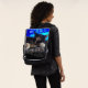 The original artwork by ZoeSPEAK on this Backpack began with Zoe’s original photograph of a cat sleeping in front of a television. The cat is a calico, with white paws coming toward the camera. A program about finance is on TV, with a bright blue graphic including the words "VENTURE CAPITAL FUNDING". Under the cat, showing her interest in financial matters, are the words "VENTURE CATIPALIST", in text with a cat fur pattern and a blue glow behind it, like the blue glow behind the cat's fur at its edges.