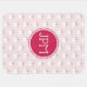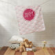A blanket with a custom monogram inside a pinkish red circle. Designed with a cute pattern of sleeping kitty cats all around looking peaceful and happy. Pink background.